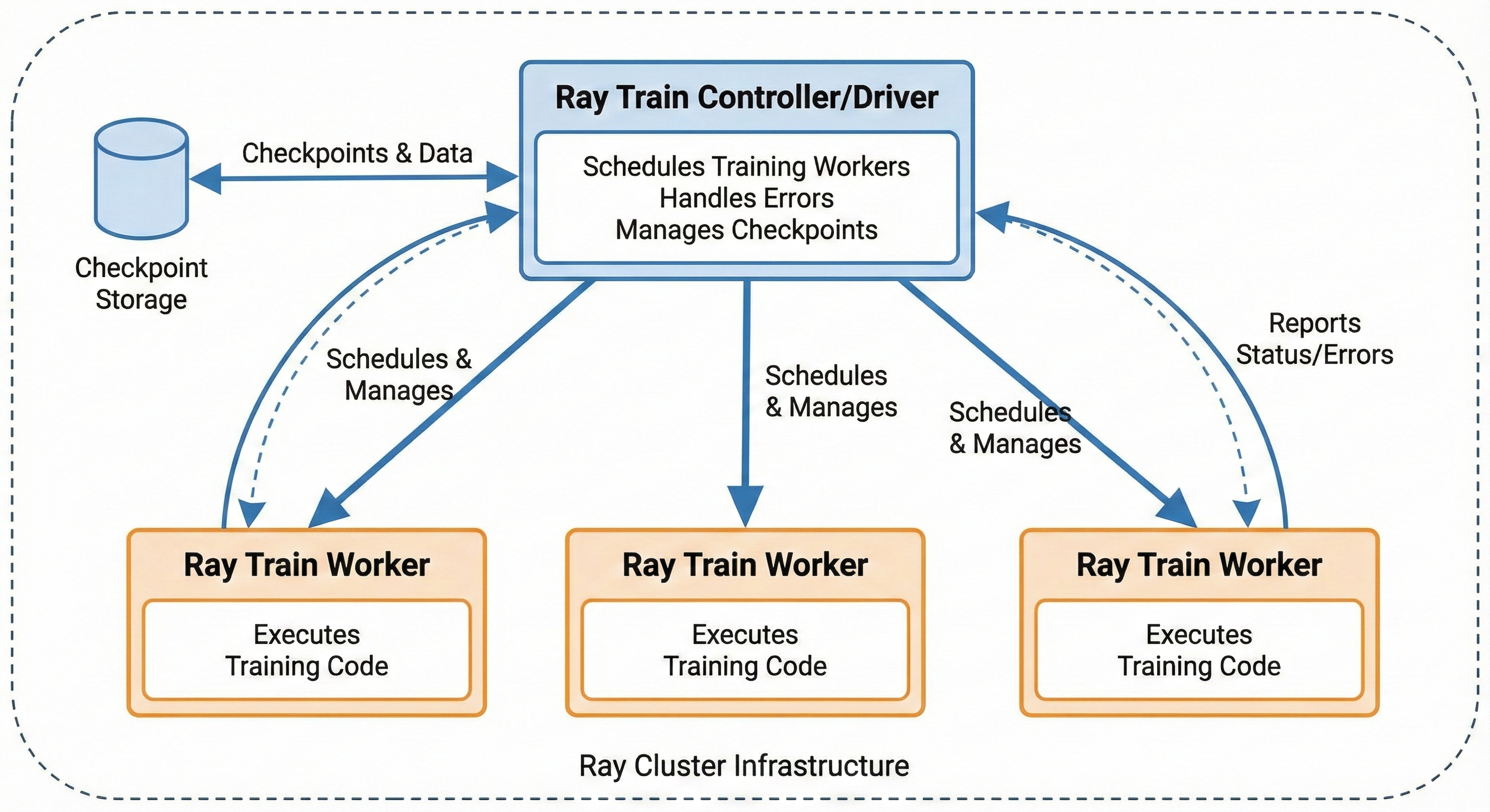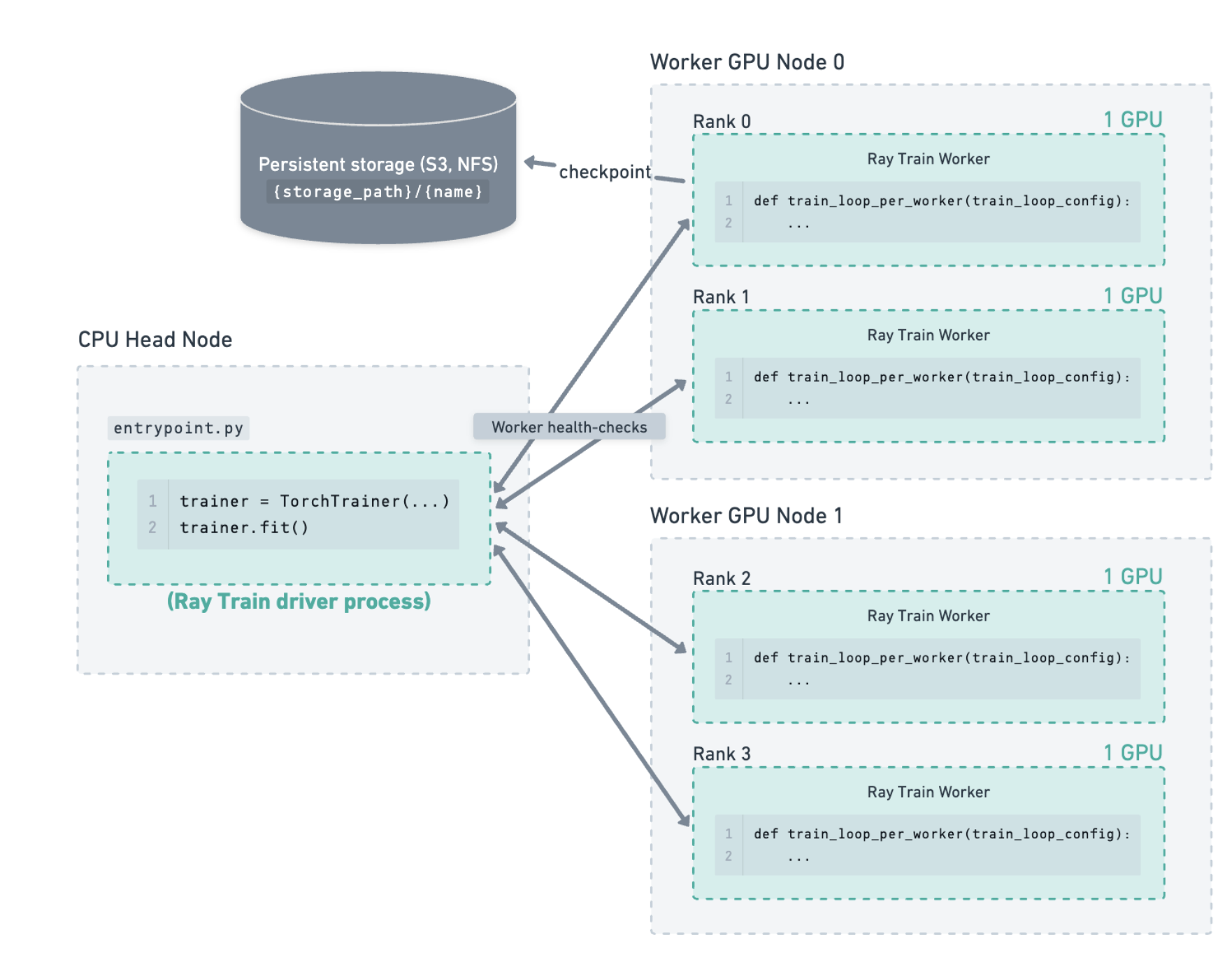 model = ray.train.torch.prepare_model(model, parallel_strategy="fsdp")4. Configure Run Checkpointing and Storage